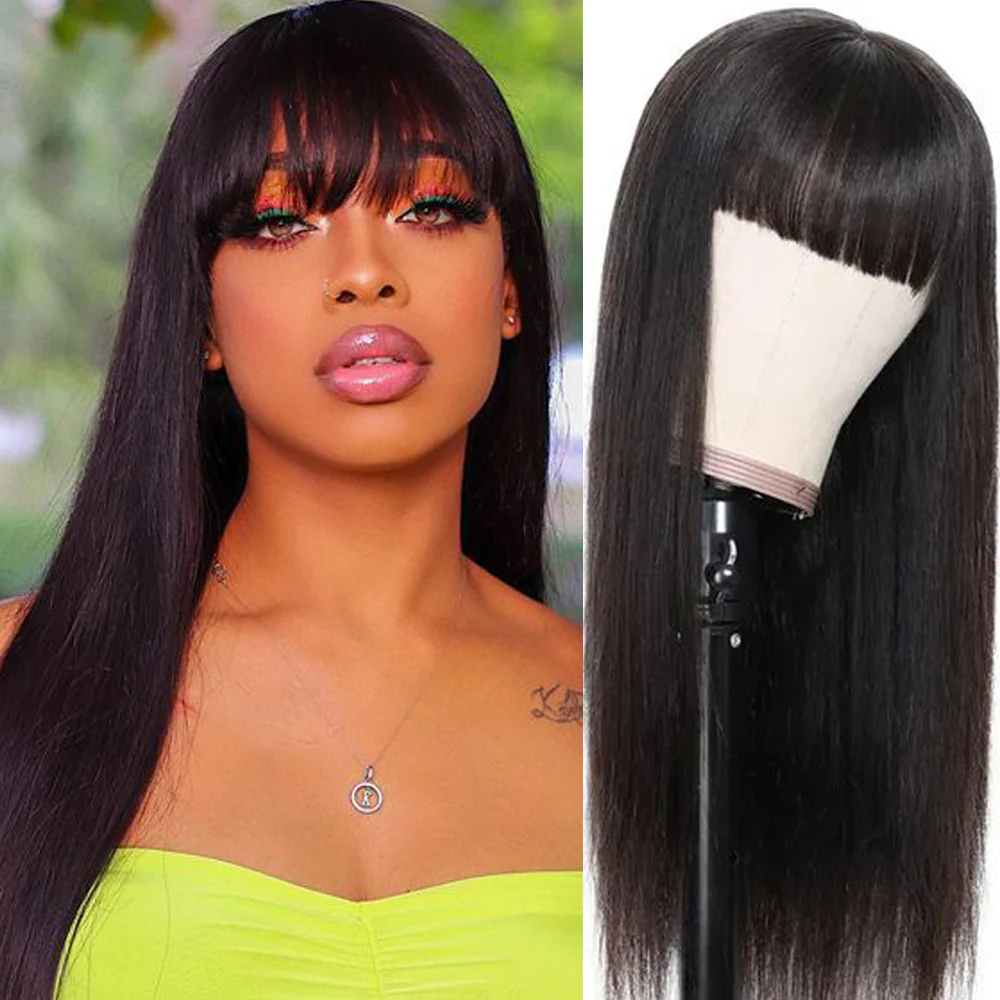 Buy 1 Get 1 Free Silk Straight Wigs With Bangs Machine Made Virgin Brazilian Hair Wig